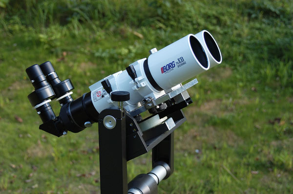 | 9/24 ボーグ76ED双眼鏡です。X軸Y軸の光軸調整装置もあります。月でファーストライトをしましたが、双眼は見え方が違いますね。惑星用の短焦点アイピースも準備中。 |