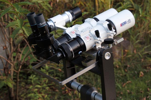 | 10/4 双眼望遠鏡にファインダーとハンドルを追加し、バランス、光軸調整も終了。快く製作を引き受けて下さったT.K.さん、ありがとうございました。アイピースは、LV20mm,10mm,5mmを用意しました。もちろん2本ずつ。 |